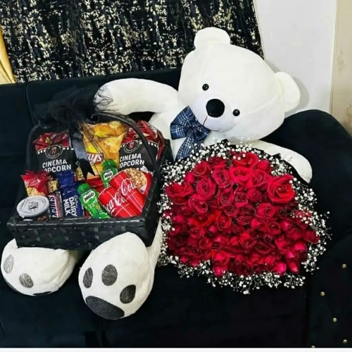 The Snacks & Cuddles Gift Set brings together a big teddy bear, a bouquet of red roses, and a basket of delightful treats. A perfect mix of sweetness and love, designed to make any celebration extra special.