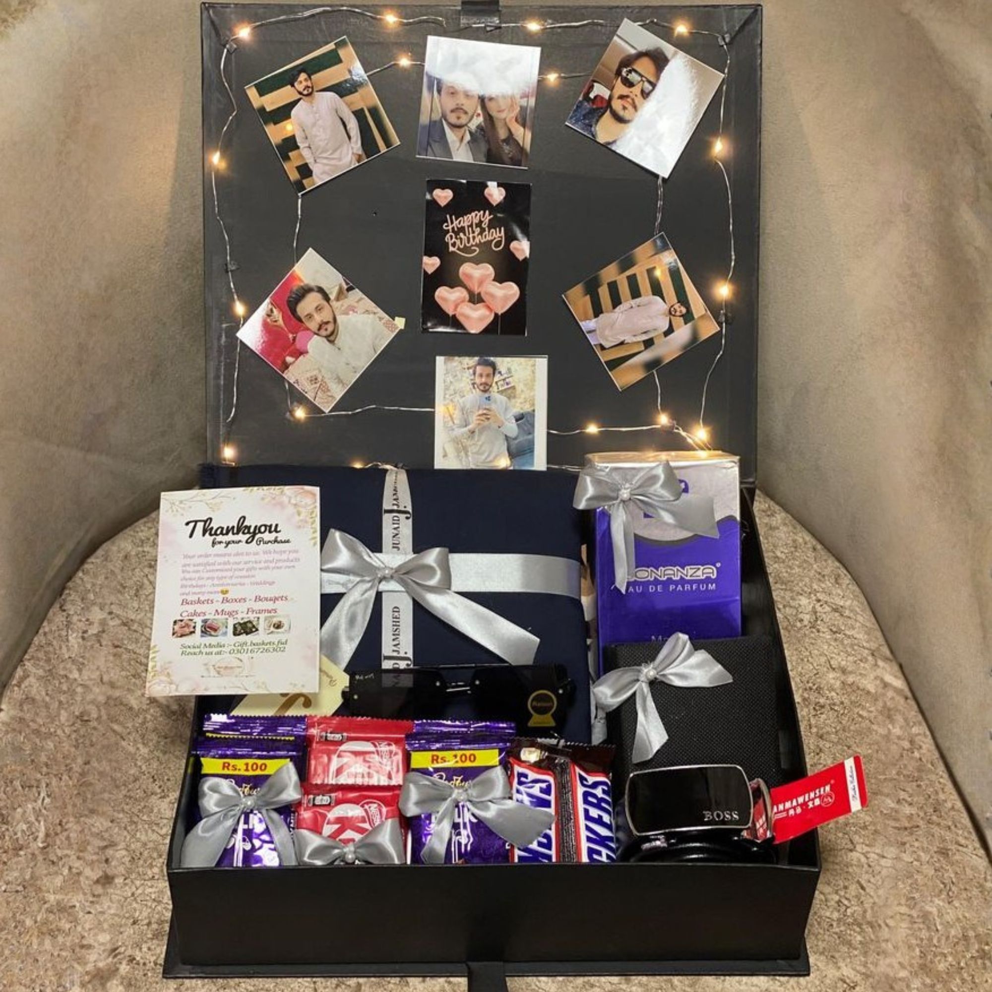 A unique and thoughtful gift box featuring personalized photos, sweet treats, and premium accessories — beautifully arranged with lights to create unforgettable memories for birthdays and special occasions.